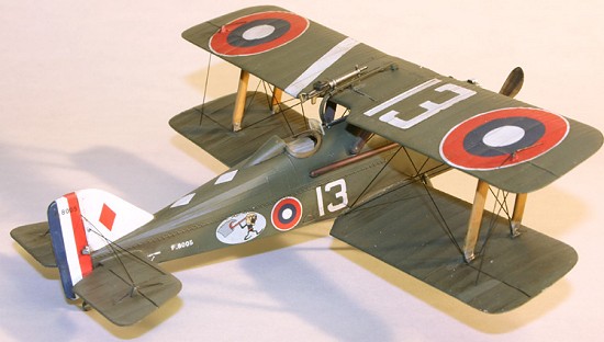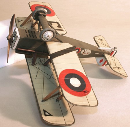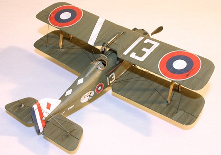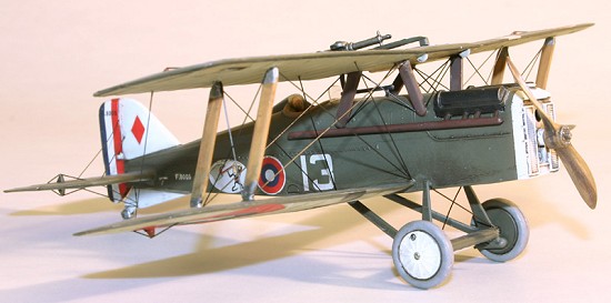 Once all of this was done and the “fiddly bits” painted and ready, I assembled all the elements. For this job, I recommend Tamyia’s extra-thin liquid glue, as it melts its way through the paint easily, dries quickly and does not damage the finish (in fact; I assemble the parts, then add a drop of glue that will stay where it’s supposed to stay because of the capillarity effect. All was going to work fine, until I discovered this kit’s main glitch : the main interplane struts are too short, something that could only be corrected in two ways : either by making new ones, or by shortening the cabane struts (but the aircraft would look definitely awkward. As I was much too far into this project to perform such major surgery, I decided to go on, applied superglue and forced the upper wing in place, thus loosing a lot of its typical dihedral (I should have noticed by watching the picture of the built model on the instructions sheet – silly me).
