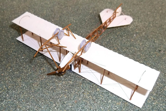 When the wings and struts were complete I cemented the pin on the fuselage into the lower wing and the 4 struts on each side of the fuselage. The rear of the fuselage was supported while this sub-assembly dried. Care must be taken at this stage to get the fuselage and strut alignment correct otherwise the model will not be true. This took me three attempts to get right because on two occasions I failed to get the fuselage lined up properly. I eventually managed this and found it to be the most difficult part of the build. When the structure is aligned and dried out add the four outermost struts to the lower wing and while these are still mobile drop the top wing on to the 8 struts. Do this by putting a small drop of cement into the holes under the upper wing and carefully lowering the wing onto the struts. Finally secure all the struts with liquid cement and allow the whole structure to dry thoroughly. The fuel tank and horizontal bars can now be added to the inner starboard (right) pair of struts. When this is dry add the last of the struts, starting with the inner pairs and work outwards. Now the horizontal tail surface can be cemented into place and the engine and radiator added to the front.