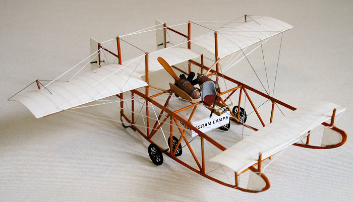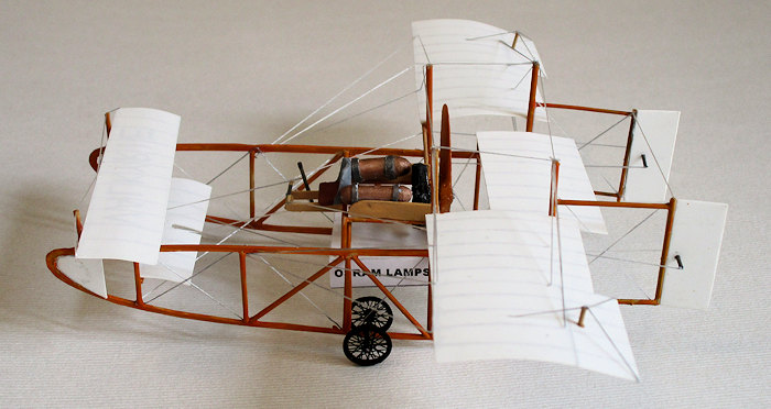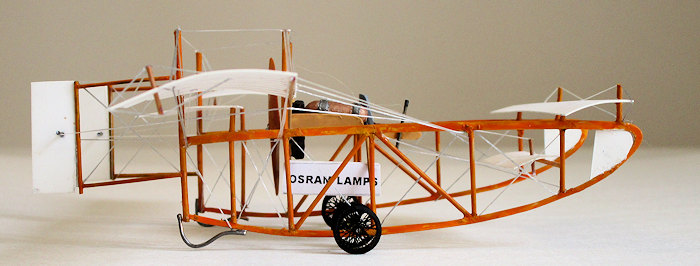 Finally the coup de grace, the defining moment, that thing which gives a model some distinction: a box of Osram light bulbs. The box was made from thin card, and the Osram logo was printed out in 6 point Gill Sans capitals and attached to each side. It was slung under the pilot, using minute bungee cords to minimise vibration to the light bulbs. Inside the box are a two dozen tiny electric light bulbs, a bill of lading and an invoice for £100 sterling. Alas none of it cannot be seen.