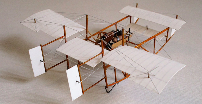 The lower foreplane has a section cut out of the middle to clear the control wires, which run from a control horn to the side-mounted joystick. The centre section of wing rests quite easily between kingposts and frames. But the two outer wings are trickier. It is best to give them a main spar at the leading edge, with an overhang which bends downwards to become a brace to the main frames. Watch out for the slight dihedral.
