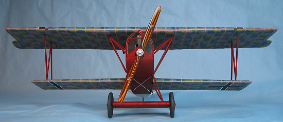 At this time prior to installing the upper wing, I glued the machine guns, fuel gauge and tachometer in place. This would be very difficult to do if the wing were on. Also, one additional modification needs to be made. The exhaust pipe that comes out on the port side of the plane needs to be cut and angled slightly back. This will allow the cabane strut to clear the exhaust.