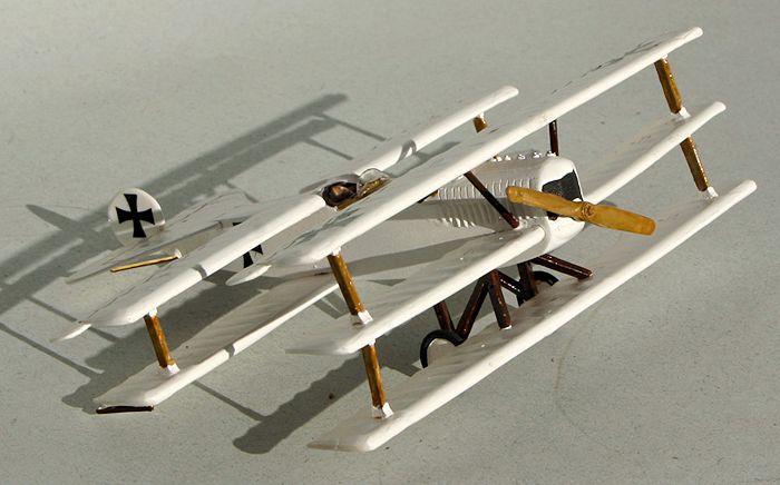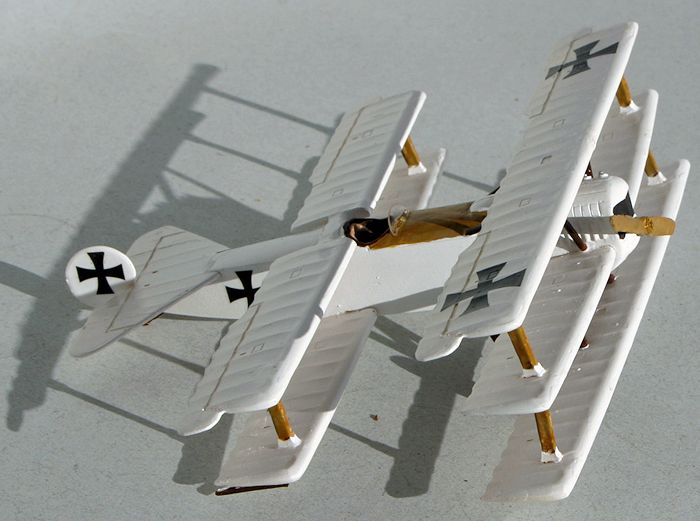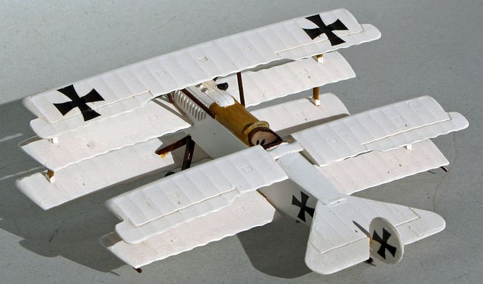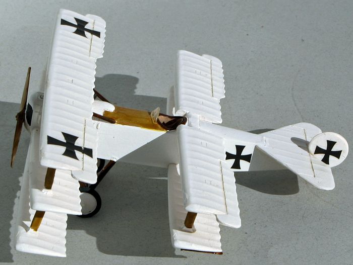 The upper wing was relatively straight forward, just being balanced on the outer wing struts. Hold on, looks like something missing here. A look at the one photograph I could find shows some structure in there. No sign of anything in the parts or on the photo instructions, but the profile showed something. I built a cabane from Evergreen rod, basing the structure on the V9, which was a prototype for the D.VI fighter.