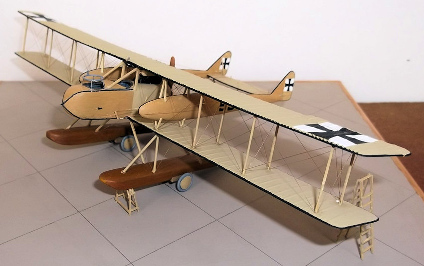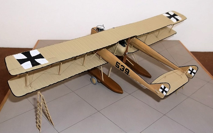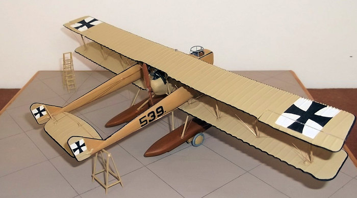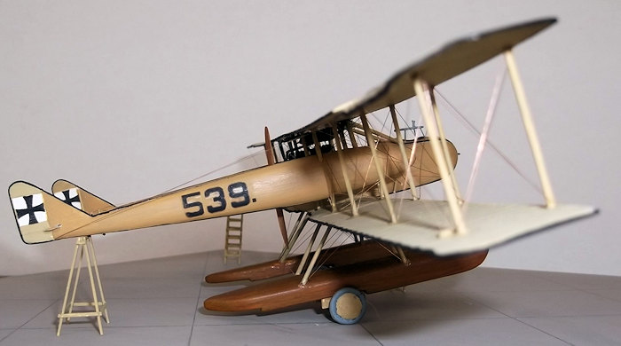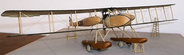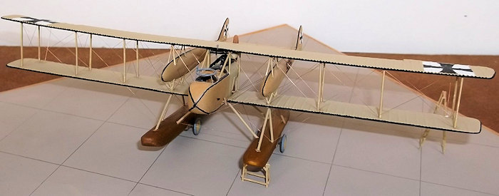 The best source of information and plans for this machine is the DataFile number 75. This is for the CI variants - the CII extended wing was exactly 60 feet which in scale means 10 inches so it is easy to enlarge. The lower wing span is increased by the same amount as the upper wing - all the other dimensions remained the same. I estimated the float dimensions from a drawing and from an excellent photo of 539, both of which I found on the net. K. Munson's Bombers 1914-1919 in the Blandford colour series also provided some background information. There are various pieces of information scattered around a number of websites, one of the more useful being flyingmachines.ru but it is relatively easy to find information on this type.