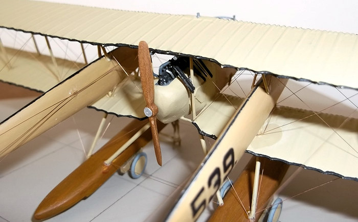 I rig my models with 40 SWG copper wire which is rolled straight with a piece of brass strip on a wooden block and attached with superglue. I measure each length from the model using a pair of dividers and start with the short sections between the boom struts as these are the least accessible. These were followed by the rear of the wings and between the front and rear pairs of struts. The control cables on the insides of the booms were next, followed by the tail surfaces and supports. The the control wires from the booms to tail were fitted, followed by the front of the wings except for the inner bay between the booms and nacelle. Here the control wires were fixed before the bracing wires. Finally the floats were rigged followed by the anti- drag wires at the front and rear. To finish the model I added the raised gun ring over the observer's cockpit and a propellor which I had carved from a piece of strip wood.