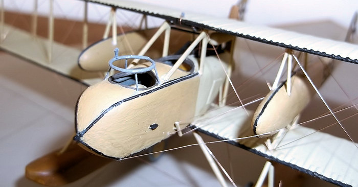 Assembly began by attaching the lower wings to the fuselage. This joint is small and consequently potentially weak, but I strengthened it by drilling two small holes in the inner edges of the wings and one in the lower rear of the fuselage nacelle. I then inserted a steel pin through the nacelle and into each lower wing. This requires very careful measurement and drilling but it was successful and undoubtedly helps to strengthen the joint. The wing to fuselage struts were glued into place and the model was ready for the main painting stage.