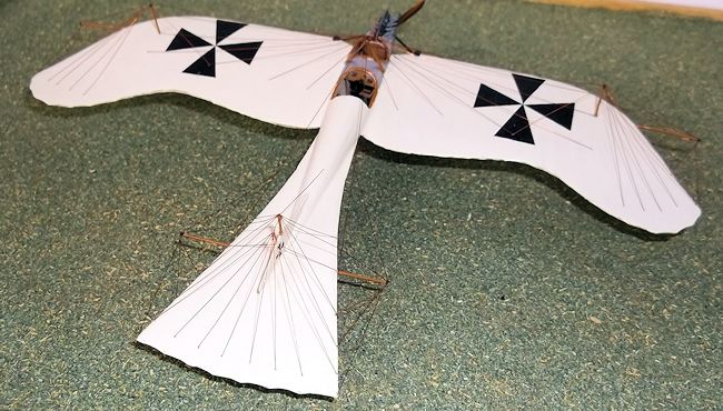 horizontal surfaces, control wires from fuselage spine to rudder and bracing