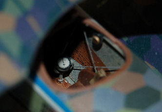 I previously mentioned decaling the interior fuselage walls with lozenge from Americals. The interior framing was painted RLM Grey, as were the joystick, rudder pedals, and gun mounts. The area behind the seat was also covered in lozenge fabric, printed side up this time. The floorboard and joystick handles were painted Gunze Wood Brown, glazed with a thinned coat of Testor’s Brown to simulate wood grain. The seat was painted Model Master Leather, the seatbelts painted Sail Color and the seat assembly given a wash of Burnt Umber and then drybrushed for highlights. Cockpit coaming was painted with Gunze Wood Brown.