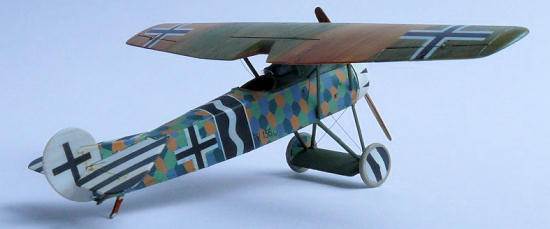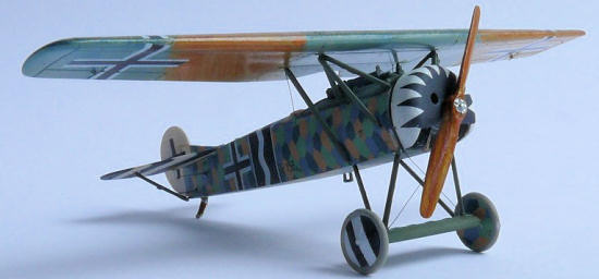 Finally the top wing was painted to look as if it was stained and then varnished, this took a few times, but eventually I got the hang of it. I used heavily diluted Humbrol to lay down a very transparent layer, then slowly using a toothpick I added a few dots of less thinned paint and used a bigger brush to blend it all into streaks. This works best on matte paint. I think the topside came out better than the bottom, the colours just look too dark to me, but after about 4 tries I gave up and left it like this. The colours are debatable anyway (just go and have a look at The Aerodrome forums and do search for Fokker E.V/D.VIII wing colour!) and out of 3 possibilities (standard green, streaked green, four colour stained) I chose the most colourful simply because I liked that the most, authentic or not. Then Gloss was applied and the decals (which are oversize and after cutting are now a-symmetric... drat!) put on. Finally a wash of acrylic artists paint (Payne's Gray) was put on and everything sealed with satin varnish to simulate the gloss varnish used on the real thing. A bit of the same acrylic stuff, but brown, was added to the tail and wheels to give it a bit of a used look -not too much, as they were operational only for a very short time.