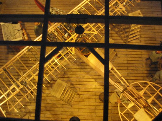 I weathered all of the wood in the following manner. The stir sticks are made of hardwood (birch, I believe). In order to soften the wood to make it more porous, I boiled the sticks for 15 minutes, then on the dry, raw wood, I painted washes of a mix of Nimbus Grey tinted with a small touch of Payne’s Grey. When these were dry (I used a hair dryer to speed up the process), I brushed on one or two very thin washes of Raw Umber. Using an old stiff bristle toothbrush and a very small amount of the same thinned Raw Umber paint, I finger-flicked (my term) a fine spray of paint over everything to give it a weathered look (Ill. 4). This same method was used to weather the hangar furnishings. In order to make the blueprints on the tabletop, I photocopied a rigging plan of the aircraft to scale and then lightly washed Ultramarine Blue paint on the drawing side of the plans. I then rolled them up to fit the tabletop.