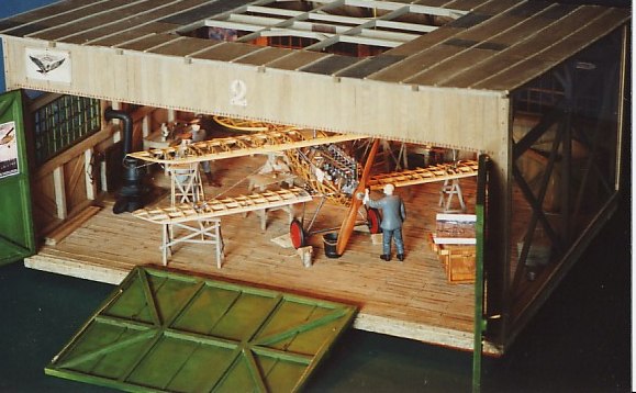 I use the Jo Sonja brand of acrylic paint because it is a gouch-acrylic, water-based paint that dries absolutely flat. Adding varying amounts of water-based varnish to the mix gives me complete control of the degree of shininess of any surface. As an added touch, I placed metal filings around the lathe, wood chips and oil stains on the floor as well as a few bird droppings on the roof. In future hangar dioramas, I will probably add a few bird nests in the rafters and a couple of mice running around the floor (just kidding......I must be going over the edge!)