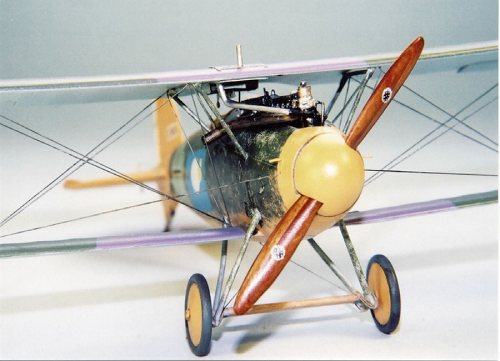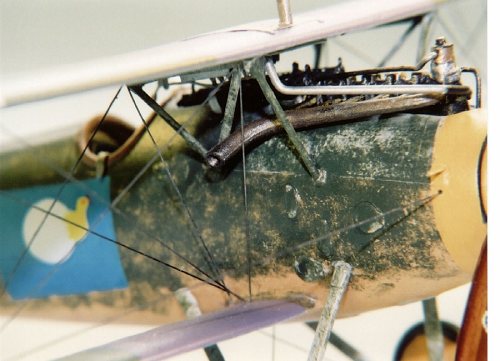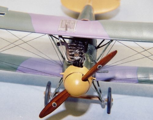 When attaching the spinner, I wanted to be sure and leave a little space between it and the nose of the aircraft. To accomplish this, I glued a piece of styrofoam on the inside of the spinner, and then glued the styrofoam to the propeller shaft protruding from the engine. The propeller is a wooden one produced by Martin Digmayer of the Czech Republic, and supplied by Copper State Models. Finally, the windscreen was trimmed to shape and glued on the fuselage, and rigging was added to the stabilizer control horns.