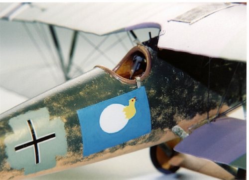 The decals used on the fuselage were made for me by two members of the World War One Mailing List, Dale Beamish and Mike Franklin. The decals were printed using an Alps printer. The chicken (“Kuchen”) decal needed some slight touching up to cover minor scratches, but otherwise the results were excellent. Many thanks to Dale and Mike for their help. The wing crosses were from the Aeromaster Albatros set. The Garuda logos on the propeller are from the IPMS Spruce Goose decal set for the NASM “Stropp” Albatros. After applying the decals, I gave the whole thing a light coat of Testor’s MM Acrylic Semi-Gloss finish.