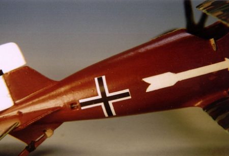 I had to decide if the rib tapes should be the normal pink and blue or whether they should be of the same lozenge material as used on the wings. Research was inconclusive as photos indicate both types were used. However, I needed another challenge for this kit, so I opted to go with the lozenge material for the rib tapes. Besides, I had never finished a kit like that before and I wanted to see if I could do it. The rib tapes were fashioned by cutting thin slices from the existing lozenge decal with a sharp razor blade. Of course, it’s nearly impossible to get all the rib tapes the same width, but it’s hard to tell once they are applied. Besides, I was aiming more for “effect” than absolute perfection. It’s a bit tedious cutting and applying the rib tapes but the end result was satisfying to me. After finishing the rib tapes, I added the wing crosses and sealed it all with Polly Scale Satin finish. I then went back over the wing crosses with a light coat of Future applied by hand. German lozenge fabric received a final coat of flat over which the insignia were applied with gloss paint, so this step was necessary to convey that gloss over flat finish.