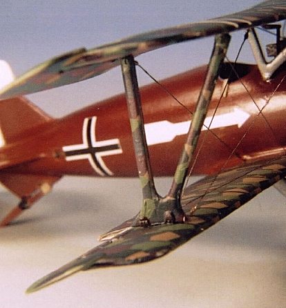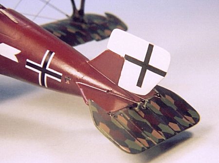The interplane struts were covered in lozenge decals. I realize this may not be entirely accurate as it is thought that many SSW had these struts hand painted to look like lozenge fabric instead of actually applying the fabric. In many cases the hand painted “lozenges” were larger than on the actual fabric so the difference would be noticeable. I didn't feel that I could accurately match the colors of the lozenge decals with paint so I decided to just use decals on the interplane struts instead of painting them by hand. Again, I was satisfied with the overall effect.