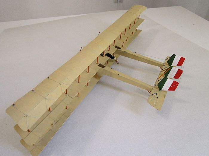 The fins were 10 thou card wrapped around a vertical rod, and painted that alluring Italian tricolour of red white and green. They were sunk through holes in the tailplane just ahead of the elevator, and then the pyramidical supports added from black rod. The two skids are attached to the lower part of each fin strut. Once all set, it can be elaborately rigged as seen. It was so large it almost resembled a small aircraft in its own right.