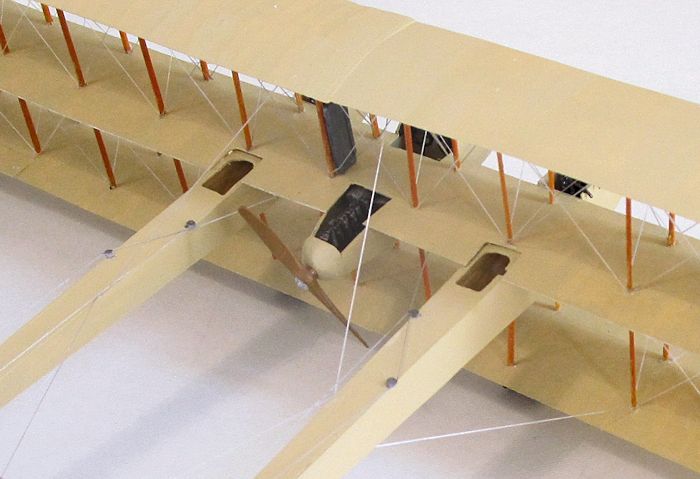 The control lines were added as the final touch. Small pulleys were made from end-cuts of rod, and placed on the upper and lower wings and also the tail booms. Control lines were then easy to rig. Finally there were one or two more lines from the nacelle out to the wings, and also to the undercarriage.