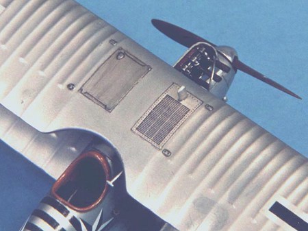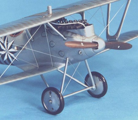 The paint scheme is very simple, the usual Pfalz "Silbergrau", with a black tail. I used a 50:50 mix of Floquil Old Silver and Gunmetal airbrushed on. After a short drying time, I masked the aft fuselage and airbrushed Testor flat black. The Floquil paints accept masking tape very well, and only small particles pulled off on the tape and did not mar the finish. After the paint scheme cured for a day, I shot a light coat of Future to prepare the surface for decaling.