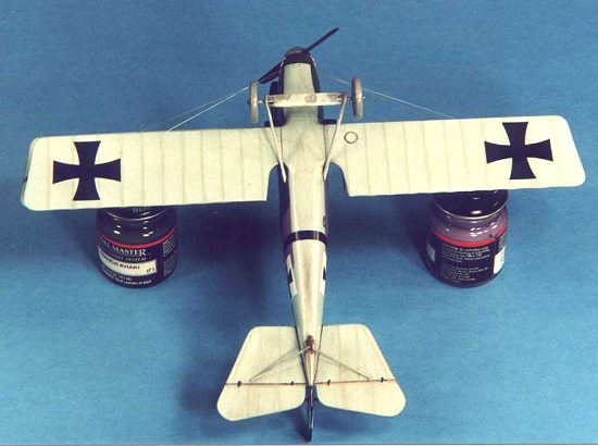 The next step was to install the lower wings to the fuselage and here I ran into some fit problems. Pictures of the Roland indicate that the lower wing is smoothly faired into the fuselage, but there are significant gaps and seams after this piece was glued into place. Extensive puttying and sculpting was needed to smooth out this join with a lot of filing and sanding. The observer’s cupola has the same fit problem and the same process was repeated. Unfortunately, these are the only pieces that don’t "fit like a glove" and change this kit from an extremely easy build to a slightly tougher challenge. I then installed the horizontal stabilizers and tail fin with no problems and prepared for a trip to the paint shop by placing the window masks on and stuffing tissue paper in the cockpit openings.
