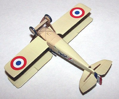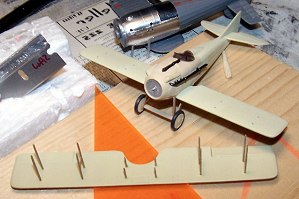 The kit oddly provides photoetched pieces for cabane strut braces -- the photos clearly show that cables were used. All rigging was done with stretched sprue. This was a tad time-consuming given the small size and the extensive rigging in the kit, including the double flying wires, but I prefer this method to drilling 50 holes in a perfectly good model.