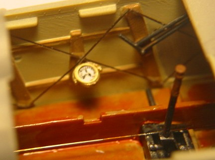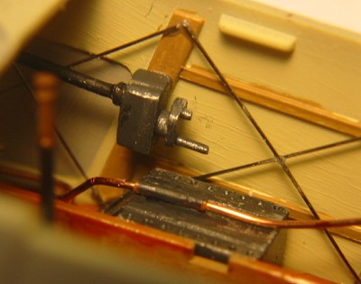 The kit oil tank has only some of the plumbing it should have—it has a just one short stub, in the wrong spot, that goes nowhere. I cut the plastic pipe off, and replaced it with a piece of copper wire in the correct place. I also improved the kit rudder bar by adding pieces of .010 wire for the cables running through the cockpit back to the rear of the fuselage.
