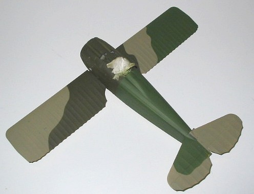 The topsides of the plane are painted in standard 5-color camouflage. I used PollyScale Acrylics, following the chart in the kit’s instructions. Painting a 5-color scheme like this will involve a lot of masking. With the bottom of the model painted and masked, I started the painting by airbrushing the model with the beige color. I let that dry for a couple of days, and then did the next color. I repeated the mask, paint, and wait process for the medium green, dark green, dark brown, and black areas. (For the black area, I used scale black.)
