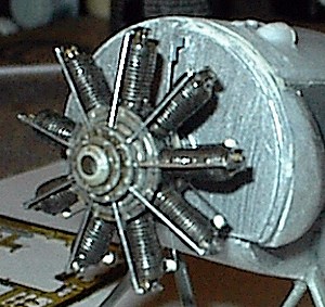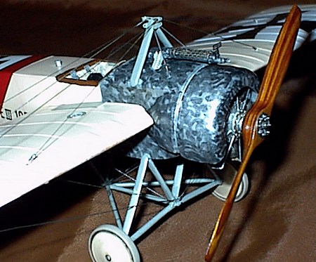 Now for the reason I have not built an E.III since the 1960s. Fokker cowl squiggles. I tried something I had been thinking about for a while. I painted the aluminum parts a coat of Testor's small bottle aluminum. When this had gotten dry enough to handle, I painted the squiggles with a pointed brush. I used Testos Metalizer, gunmetal flavor, and it turned out to be a bit dark. I recommend titanium or steel. The lacquer based Metalizer flows on and bites into the enamel. This helps in keeping the squiggles from running where they weren't put. Use a half loaded brush or the thin lacquer will run too much onto the surface. The hardest part is to keep the squiggles fairly random. Try not to repeat the same shaped squiggle too much. A couple of coats of Future to seal it and it looks pretty much like the photos.