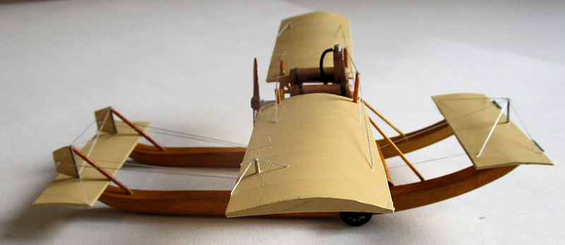 Then you will hear a drum roll for it is time for the rigging. It is not a biplane so it couldn't be easier. Just the usual elastic thread, coloured silver with a gel pen, and fixed using small drops of superglue applied with a sharpened toothpick. For the control lines, note that the two lines for the canard surface are off-set slightly to starboard. And also note that the rudder wires both disappear inside the central sponson, at a point just outside of each seat. Finally a propeller from the Big Bag of Dead Props, painted wood, and set at ten to four.