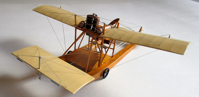 Then comes the furniture. A radiator was made up from some old mesh wrapped around two blocks of card, and then a surround of card, painted old copper or brass or something similar. Note that there is a clear gap down the centre of the radiator core, to let more air though. A simple hose from copper wire connects it to the engine. The two fuel tanks are sprue with rounded ends, painted copper, and tied down with some black thread. Note that the propeller shaft is quite long, and goes through a metal collar attached to one of the rear struts.
