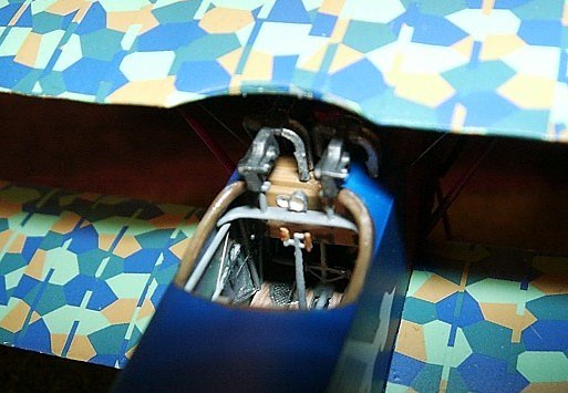 The rear cockpit „bulkhead" (in fact also lozenge fabric) was represented with normal lozenge decal. The fuselage framing was scratchbuilt from stretched sprue, painted medium gray and glued to the fuselage sides. Throttle quadrant and bracing wires were added. For the woodgrain on the cockpit floor I used a decal. The remaining parts were painted and installed. The rudder control wires were represented by fine aluminum wires. Before gluing the fuselage halves together the engine bay was airbrushed in dark gray and the engine was assembled and painted grey (crankcase, valve covers), black (cylinders) and silver (details). A wash with black and drybrushing with pastel chalk dusts gave it a realistic appearance.