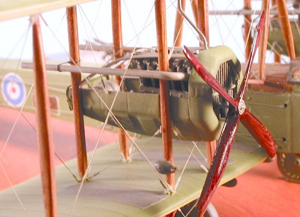 My engine nacelles were vacuformed using a rig I purchased from Kingston Vacuum Works. I cut down the kit engine nacelle to a shape that would result if the engine cover panels were removed and used those as my mold. I used Aeroclub Liberty engines and scratchbuilt the nacelle framing as well as the horizontal radiator louvers and exhaust manifolds. The props are hand carved by Marty Digmayer. (I guess having Marty do my props indicates that I can be a pretty spoiled girl at times.)