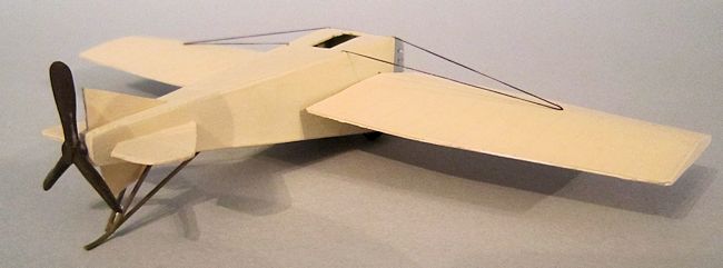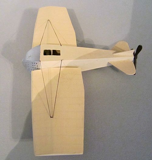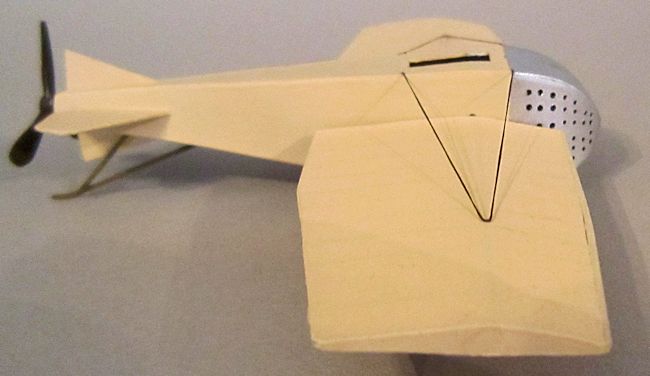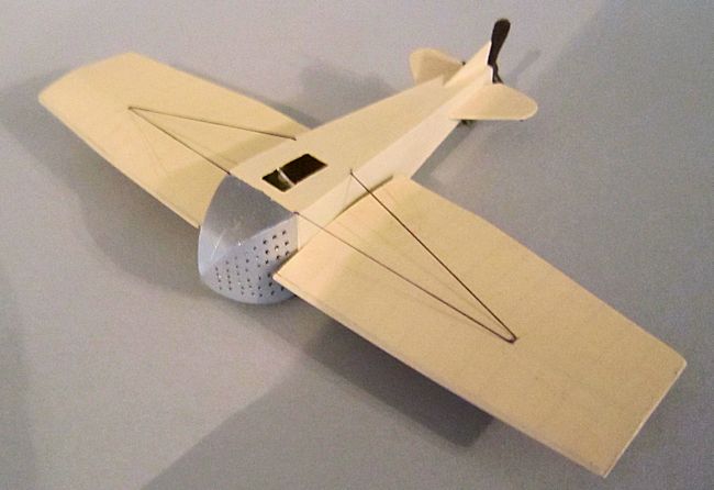 Finally a couple of bracing wires from the cockpit area of the fuselage to the wings. You will find some variation in information here. Some plans show them as joining the wing with a small distance between them, some as joining at the same point. I chose the latter, using elastic thread, coloured with a black felt tip pen.