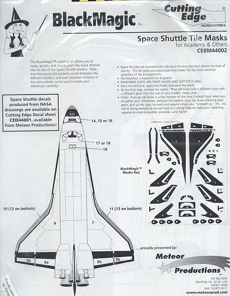 Basically, according to the instructions, what one does with these is to paint the airframe, apply the masks, and then paint the black areas. The sets also include wheel masks as well as masks for the solid boosters. Frankly, these are well worth the cost, as the Shuttles are complex shapes that will take hours to mask the standard way.
