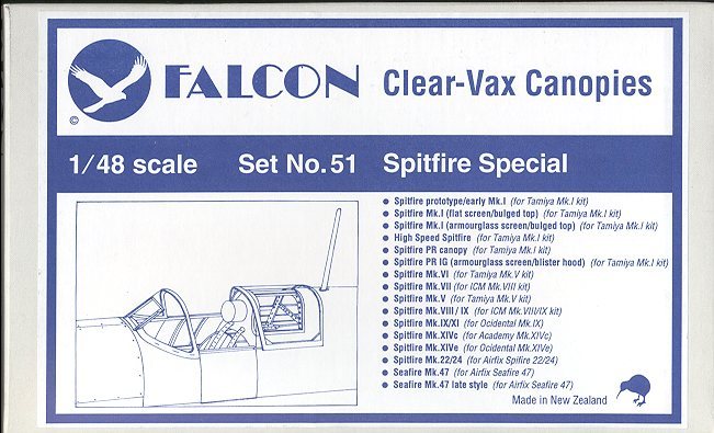 Many people really like to use vacuformed canopies on their kits. Often times they are much clearer than the injected ones supplied and if doing an open canopy, the thinness of the plastic is much closer to prototypical than injected ones. For years, the best canopies on the market have come from Falcon of New Zealand. They currently offer over 45 different sets in both 1/72 and 1/48. This particular one is their most recent and is set 51 for the Spitfire.