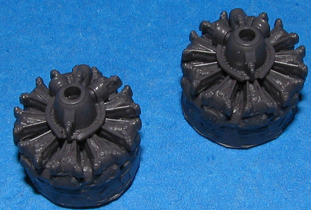 This set from Flying Fish Models is a Universal R-2800 (though what 'universal' means is unknown to this reviewer). The FFM website indicates it is for types such as the P-61 and Ventura. The engines themselves are very nicely molded, especially when one considers they are 1/72 scale and are pre-drilled to accept a prop. Once removed from the pour stub, it will be an easy task to paint them and used them to replace the often inaccurate kit engines. Image is several times the actual size of the engines