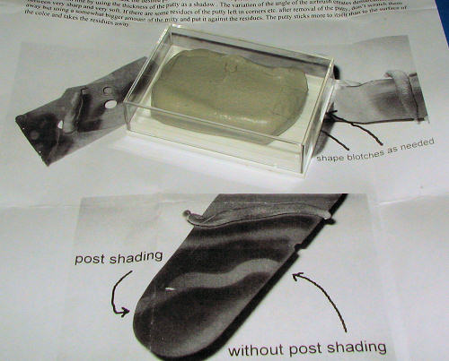 You simply roll out sections of it an apply it to your model. Then you simply spray on the layer of paint. How closely you spray to the putty will determine how fine or fuzzy the demarcation is between the shades. When done, you pick it off the model and ready it for the next use.