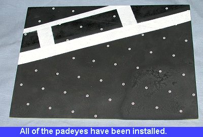 I used a toothpick to apply the superglue. Making a small puddle of glue on a sheet of glossy paper, I dipped the tip of the toothpick into the glue and made a circle of superglue around the indentation on the base. Then taking the wetted end of the toothpick, lifted up a padeye and simply placed it on top of the glue circle. I wetted the end of the toothpick by holding it in my mouth. What little saliva was on the end of the toothpick was enough to pick up the very light etched padeye. Using this method, it took about a half hour to place all the padeyes.
