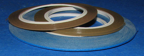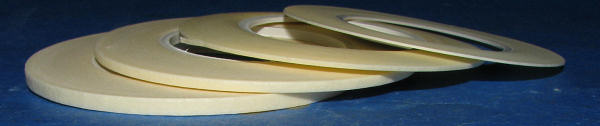 There are basically three different tapes being offered. One is a paper masking tape that is quite similar to Tamiya tape in look and performance. These are offered in a variety of thicknesses from 10 to .5mm. The samples shown above in the image are 3mm, 2mm, 1mm and .5mm