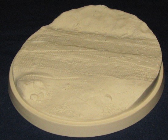 Now they have gone to the basics with a series of resin bases for 1/72 armor. These bases are all superbly molded and basically ready to paint. This nearly circular base measures 6 x 5.5 inches and is on a slight downward slope . No softskin wheel marks on this one, pure tracked vehicles only for this one. Again, the surface is up to interpretation as there is room for anything from sand to a road through a forested area if you are willing to put in the foliage.