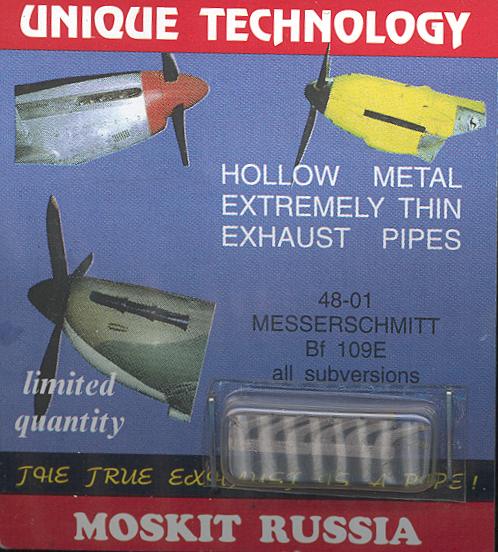 Later on, at one of our club meetings, a member brought in a 1/48 Monogram Bf-110 that he had used these exhausts on. I was really impressed. They look absolutely super! They have the kind of thin walls that I could never duplicate, especially when one is dealing with exhaust pipes that are not round, like those on the Bf-109. So I have bought a set...or two...or three. Alright, I have three sets. One for the Bf-109E is shown below on the left, one for a Bf-109G/K (shown on the right), and another set for the Yak-9D.
