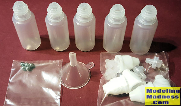 This particular set is 10mm, the next to smallest size, and consists of five bottles, the dropper inserts, caps and to help mix the paints, non-rusting BB's. A nice funnel is also included to help in pouring material into each bottle. There is an instruction sheet with each set that includes a graduation of every 2mm so that you can etch these markings on your bottles if you so wish. These are perfect for those who mix their own colors or just like premixing paints for use on down the road. This latter item is appealing to me as I do this all the time using old glass paint bottles.