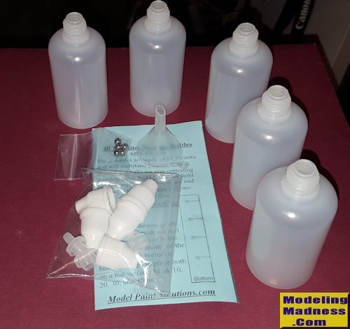 This particular set is 40mm, which is their largest size. These would be great for thinners or for those colors that one uses a lot. In line with their other sets, this one consists of five bottles, the dropper inserts, caps and to help mix the paints, non-rusting BB's. A nice funnel is also included to help in pouring material into each bottle. There is an instruction sheet with each set that includes a graduation of every 10mm so that you can etch these markings on your bottles if you so wish. These are perfect for those who mix their own colors or just like premixing paints for use on down the road.