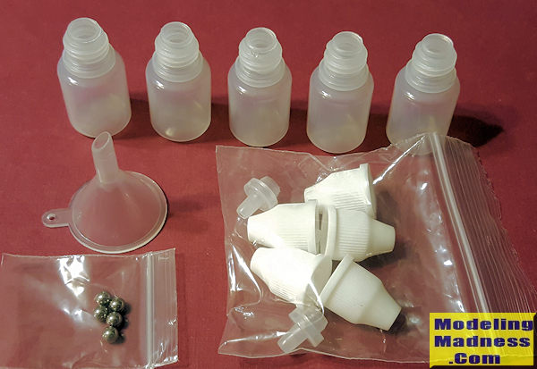 This particular set is 6mm, the smallest size, and consists of five bottles, the dropper inserts, caps and to help mix the paints, non-rusting BB's. A nice funnel is also included to help in pouring material into each bottle. There is an instruction sheet with each set that includes a graduation of every 2mm so that you can etch these markings on your bottles if you so wish. These are perfect for those who mix their own colors or just like premixing paints for use on down the road. This latter item is appealing to me as I do this all the time using old glass paint bottles.