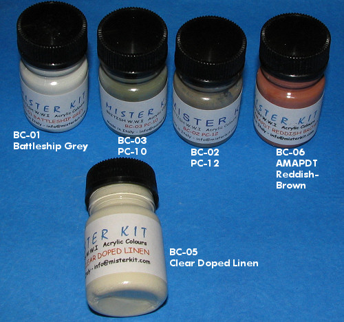 A few weeks ago, Michael Taylor of Mister Kit USA contacted me and asked if I'd like to try out his WWI paints. Mister Kit produces what is probably the widest range of acrylic paints for WWI aircraft and these are considered by many to be the most accurate and best around. Realizing that I (a) don't build a lot of WWI kits and (b) generally use enamels, I thought about it for a while and then worked out that whatever colors are used on a Sopwith Triplane would be the best bet for m. This is because there is little in the way of freehand detail work and it would give me an opportunity to try these out.