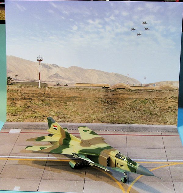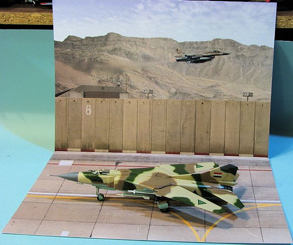 This is the 1/72 version, which is 31 cm / 12.2 inch by 22 cm / 8.66 inch in size. These sets come in two versions. Version one includes three prints (basically two backdrops) and a 3D representation of a concrete revetment wall as shown below with the F-16 taking off on the background. The other set, version two, has the backdrop that has an earth and grass revetment as shown to the left. This shows a diamond formation of four F-16s in the background. The set being reviewed is the version one set. Much to my embarrassment, I do not have an Israeli AF model in this scale to show, so instead chose a defecting Iraqi MiG-23 to show off the set.
