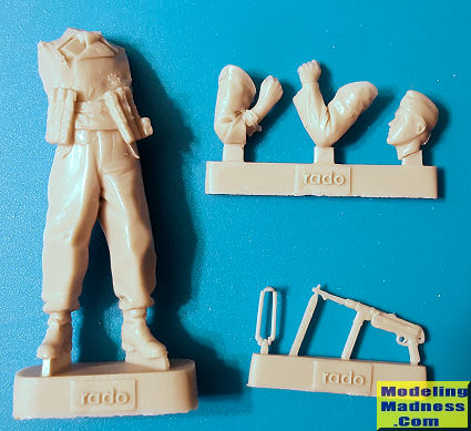 It is an SS figure and is superbly cast in a greyish resin. The majority of the body is cast in one piece and you only need to add the arms, head, weapon and strap. Now some figures will provide you with a ton of separate pieces, but to me, simple is better, especially when the molding is well done. The box illustration can be used as a painting guide.