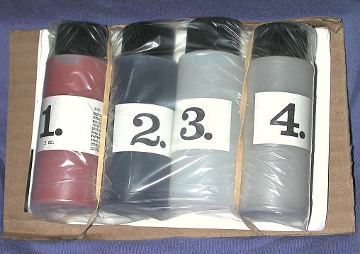Rustall is also packaged with three other materials. In the image above, #1 is Rustall, #2 is a black wash used to highlight items like protruding bolt heads and panel lines, #3 is a dead flat clear coat, and #4 is dust. This final material is not a liquid but is, indeed, dust. Much to the same consistency as diatomatious (sp?) earth. It can be added to any material or just sprinkled on the subject and sealed in with the clear matte .