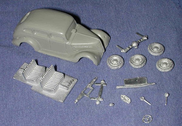 The body is resin with the rest of the kit in pewter. The molding on this kit is fair with most of the metal parts having rather large mold seams that will have to be carefully removed. The resin body itself has quite a few pinholes, especially in the back, that will need filled. I'm not an expert on the type, but it also seems as if the window pillars are somewhat 'caved in' and not flush with the rest of the outside. No clear bits are provided, but since there are no compound curves, simple pieces of clear acetate can be made to fit the openings. No decals are provided either, though there is a note that license plates are available on an aftermarket sheet.