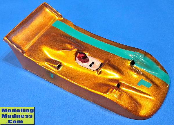 These particular paints are from their Hikari RC line and are designed for Lexan RC bodies. However, these paints work on more than clear plastic. I have brush painted some of their more common shades on plastic where it works well. Shown above is a clear slot car body painted on the inside with shades not shown in the opening image. The metallic orange would benefit from a solid backing color like white or silver. The turquoise is very opaque. I did thin the metallic orange a bit, but the turquoise was sprayed right from the bottle with no thinning.