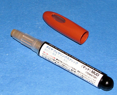Here is another neat idea for weathering. This time, instead of a compact, this is in stick form. From what I see the material in the stick and the compact is the same, but this is easier to glop on than that previous method and allows small chunks to be placed on the subject. Turning the clear collar allows more of the stick to become visible. Another fine idea from Tamiya.