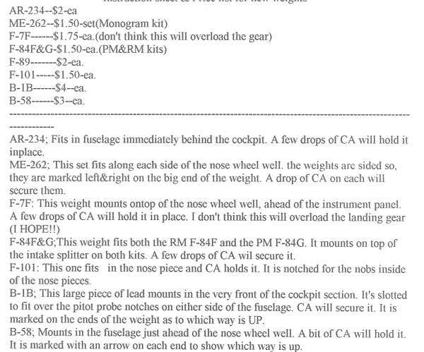 Terry Dean has just produced a second batch of weights for us. Most of the cast weights are for Monogram kits and in many cases are such a tight fit that no gluing is needed. All sets are in 1/48 scale, though Terry is considering doing these for 1/72 as well. Below are images of what is new in this second batch. A price list and how the parts fit is shown below the image.